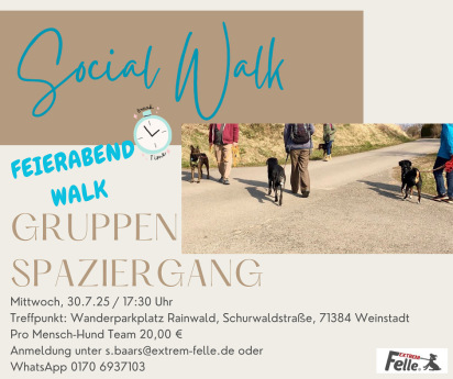 Dauer ca. 1 1/2 Stunden. Ihr benötigt eine kurze Führleine, ggf. Euren Maulkorb, ein gut sitzendes Geschirr und/oder Halsband und gerne Leckerlis.